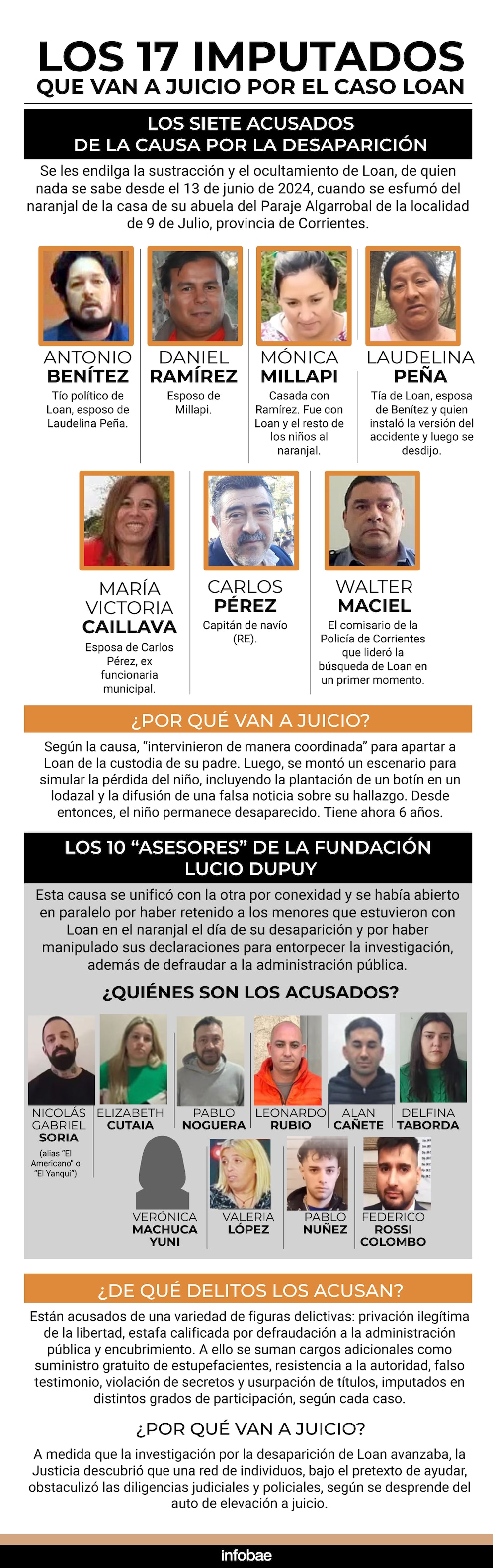 Son los 7 imputados en el expediente principal: Antonio Benítez, Laudelina Peña (tía del chico), Daniel Ramírez, Mónica Millapi, María Victoria Caillava, Carlos Pérez y el comisario Walter Maciel. Según la causa, “intervinieron de manera coordinada en la sustracción y posterior ocultamiento” del niño.